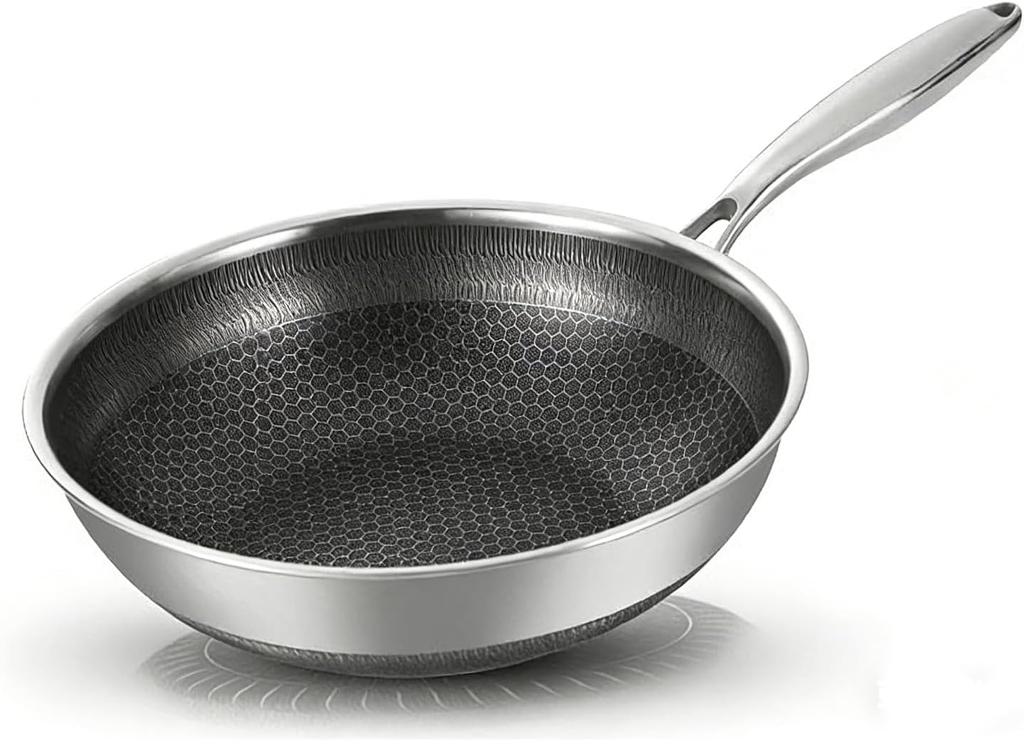 Elevate your cooking experience with the Professional 5-Ply Stainless Steel Skillet—available in two premium surface options to suit your cooking style. Engineered for precision and performance, this 10-inch skillet combines premium materials with innovative technology to deliver restaurant-quality results in your home kitchen, whether you prefer classic cooking or easier cleanup. Crafted with a professional-grade 5-ply construction, the skillet features a core layer of aluminum sandwiched between two layers of 18/10 stainless steel. This design ensures exceptional heat distribution, eliminating hot spots to help you achieve perfect searing, browning, and cooking results every time. Our exclusive Turbo Heat Technology heats up to 30% faster than conventional stainless steel pans, reducing cooking time while locking in the natural flavor of your ingredients. The ergonomic stay-cool handle is designed for comfort and safety, with a Y-shaped base and hollow center that maintains cool temperatures even during high-heat cooking. The riveted construction ensures long-lasting durability and a secure grip, so you can cook with confidence. Compatible with all cooktop surfaces—gas, electric, ceramic, and induction—and oven safe up to 500°F, this skillet seamlessly transitions from stovetop to oven without switching pans, adding versatility to your kitchen. Your family’s safety is our top priority: the skillet is completely free from harmful chemicals like lead, and cadmium. The non-reactive stainless steel surface won’t alter food flavors, preserving the original taste of your dishes, and is dishwasher safe to save you time on post-cooking cleanup. The smooth polished surface of this skillet embodies classic stainless steel cooking performance. Perfect for home chefs who love the traditional searing and browning capabilities of stainless steel—achieve a crispy, golden crust on steaks, chops, and burgers, or create rich, flavorful sauces with ease. The smooth finish is easy to clean (even by hand) and maintains its sleek, professional shine with regular use, making it a timeless addition to any kitchen. - Cooking Surface Size: 10 inches - Total Length: 18.8 inches - Net Weight: 2.4 pounds - Construction: 5-Ply (1.Interior 316 stainless steel;0.5mm thick 2.Thermal conductive layer 1050 pure aluminum;0.5mm thick 3.Thermal storage layer 3003 aluminum alloy;0.5mm thick 4.Thermal conductive layer 1050 pure aluminum;0.5mm thick 5.Exterior:430 magnetic stainless steel;0.5mm thick) - Cooktop Compatibility: Gas, Electric, Ceramic, Induction - Oven Safe Temperature: Up to 500°F (260°C) - Handle: Riveted Stainless Steel, Stay-Cool Hollow Design - Care Instructions: Dishwasher Safe; Hand Wash Recommended for Longevity - Surface Options: Smooth Polished