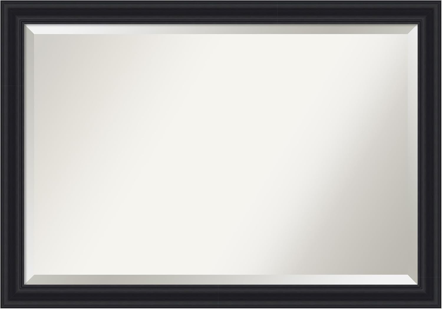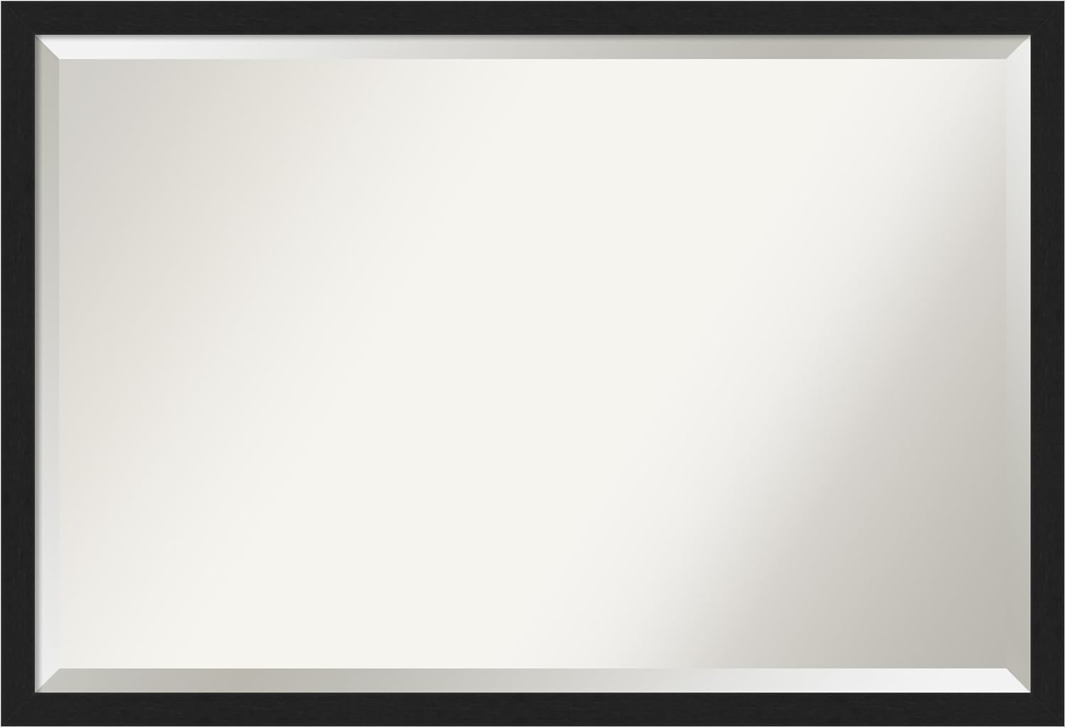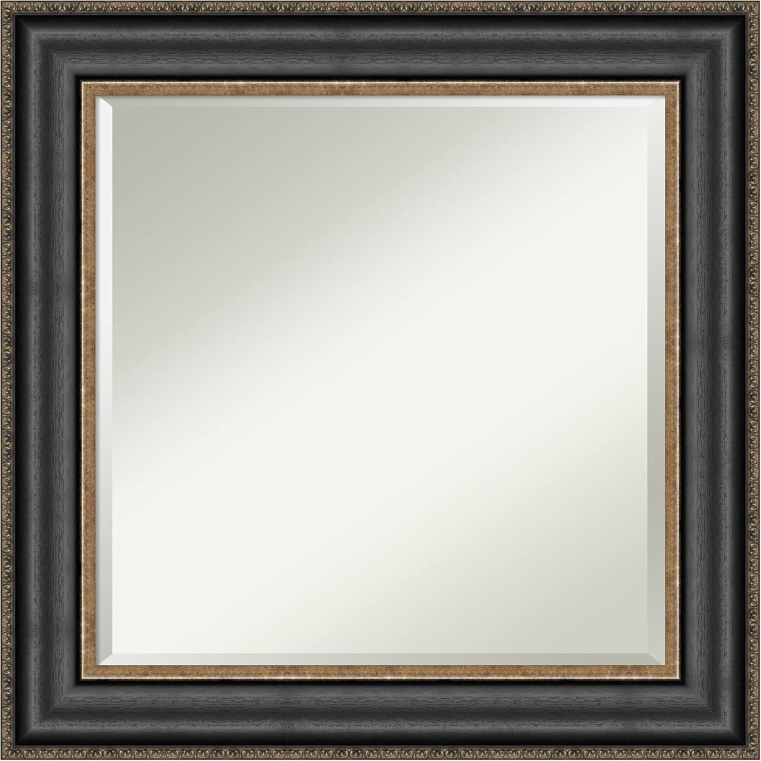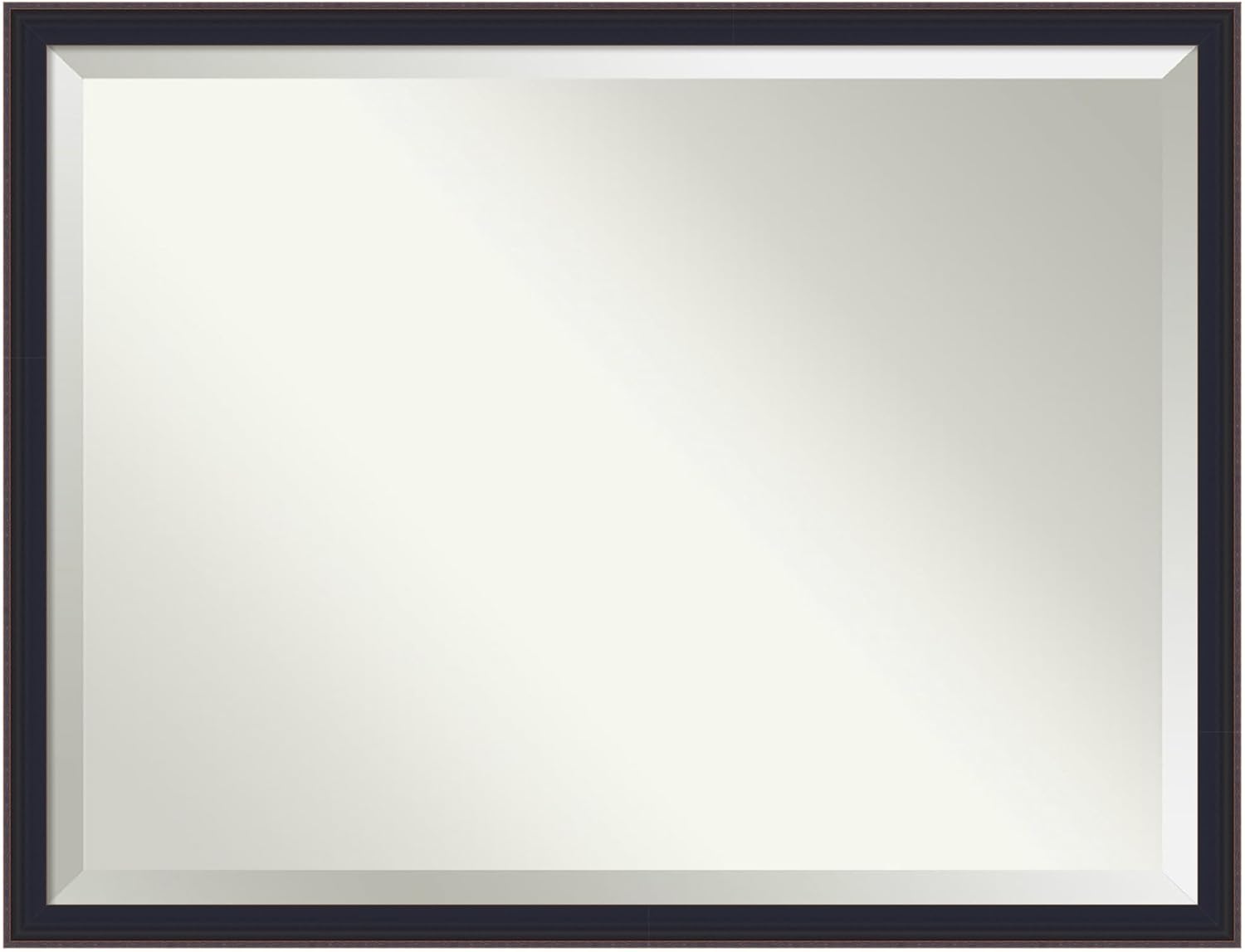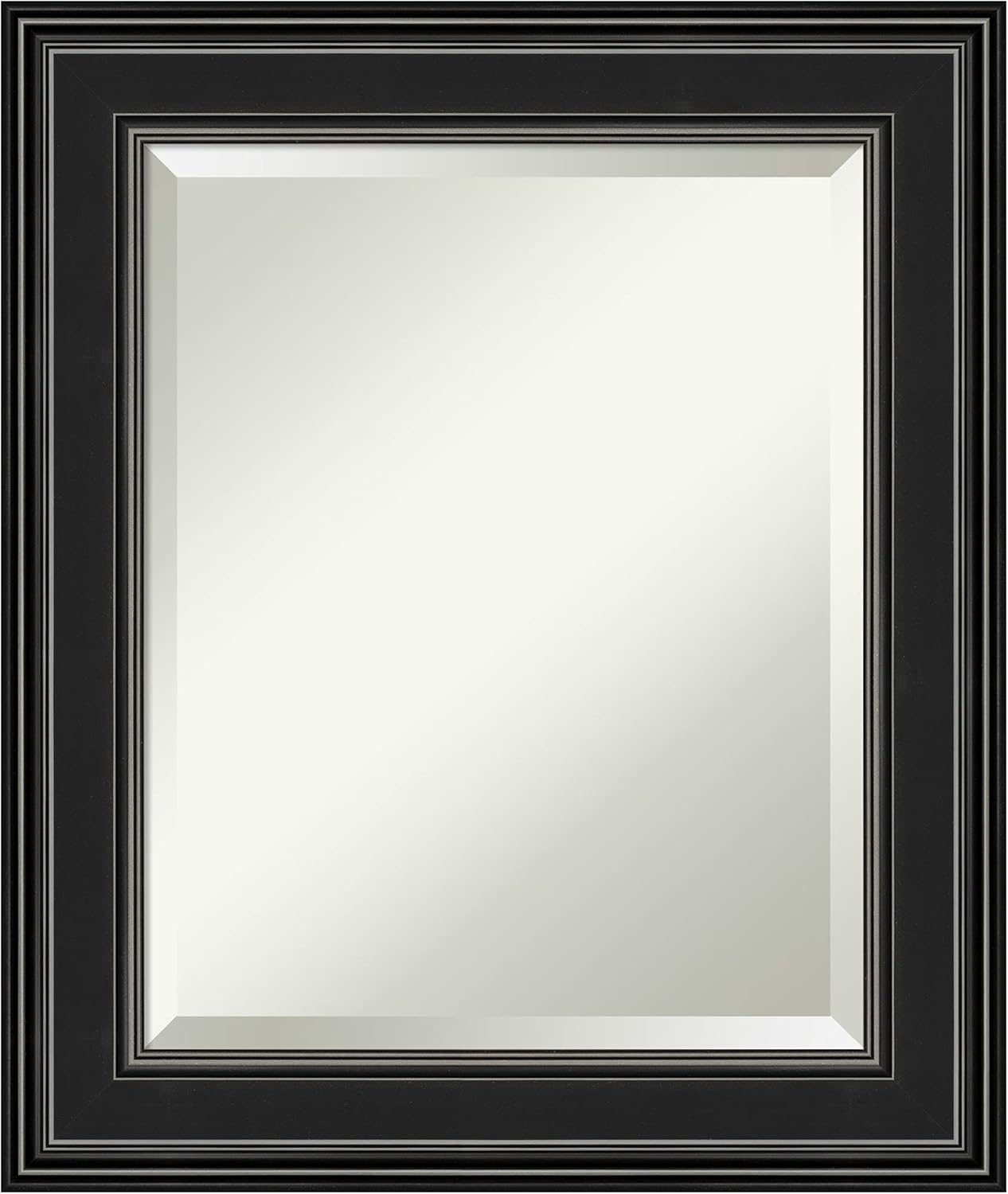 PRODUCT: Amanti Art Beveled Bathroom Wall Mirror; OUTER SIZE: 20 x 24 inches; FRAME: Shipwreck Black Narrow 2.25"; FRAME FINISH: Distressed; FRAME COLOR: Black. The Shipwreck Black Narrow frame features a distressed black frame with a grey wash and weathered pockmark details. Give your bathroom the finishing touch with this framed wall mirror. Individually made using traditional custom framing techniques, it has the quality you would expect from your local frame shop. It holds its value with premium finishing that can be appreciated up close. Because of our attention to detail and focus on artistry, architects, interior designers, and homeowners alike choose this mirror to create beautiful living spaces.