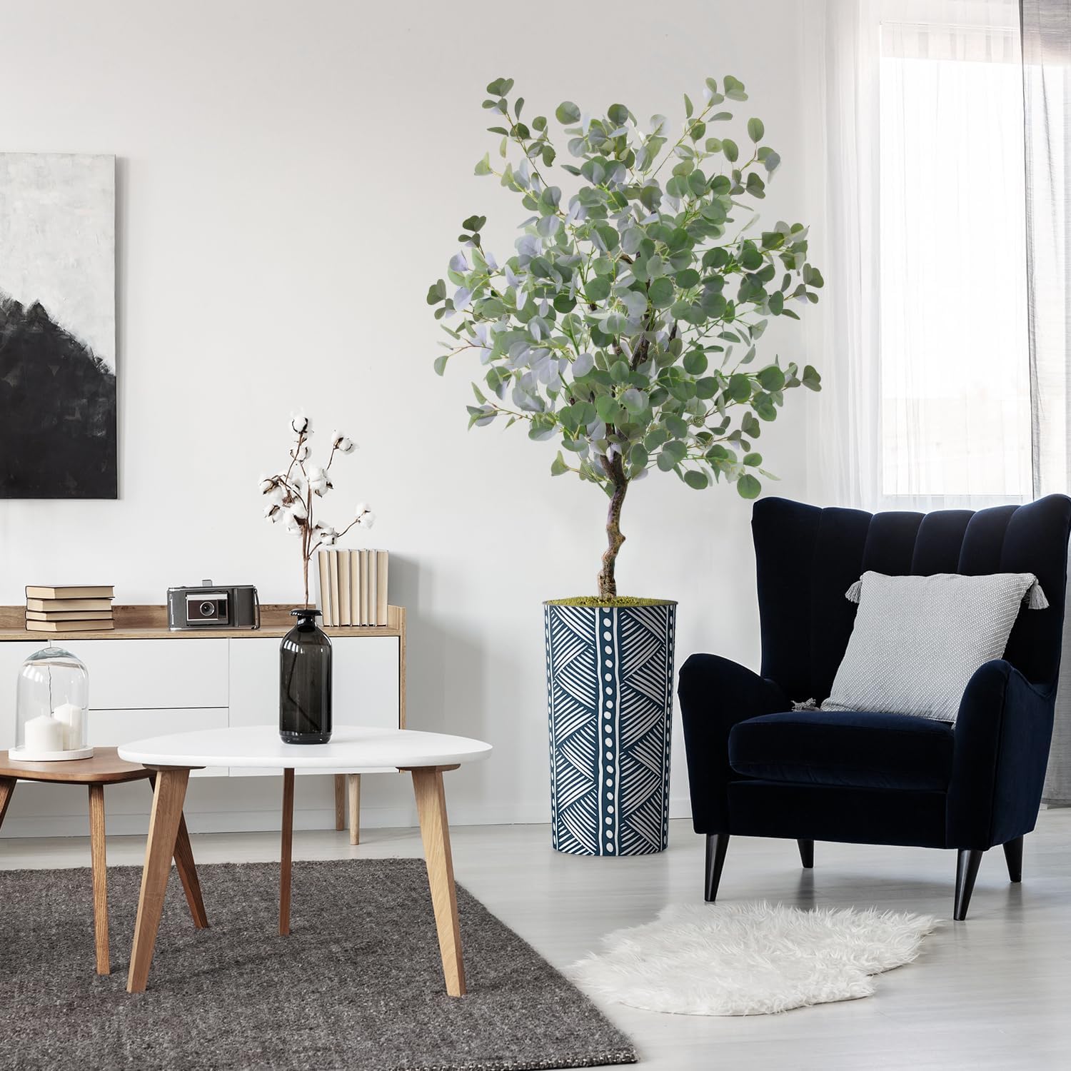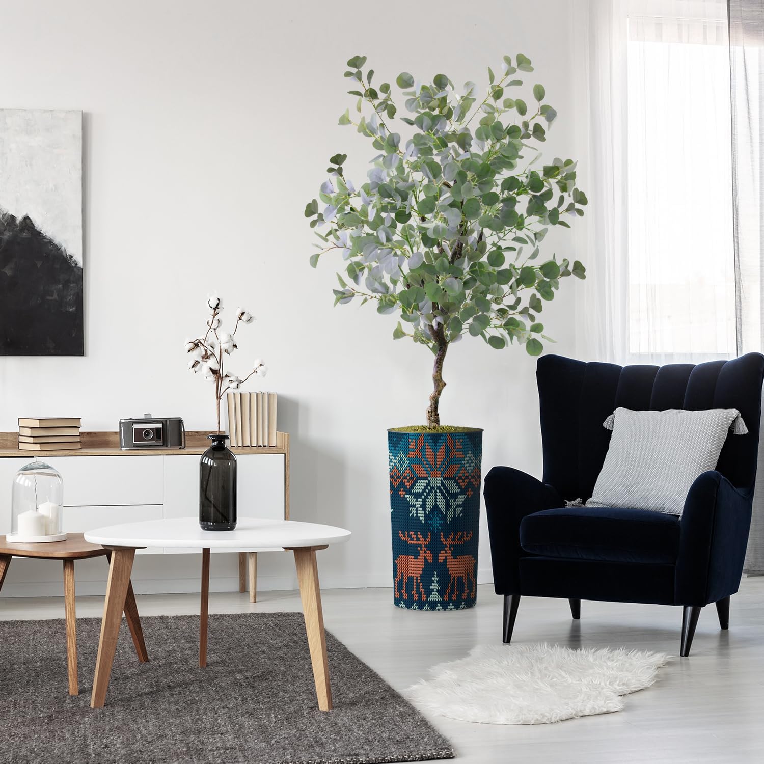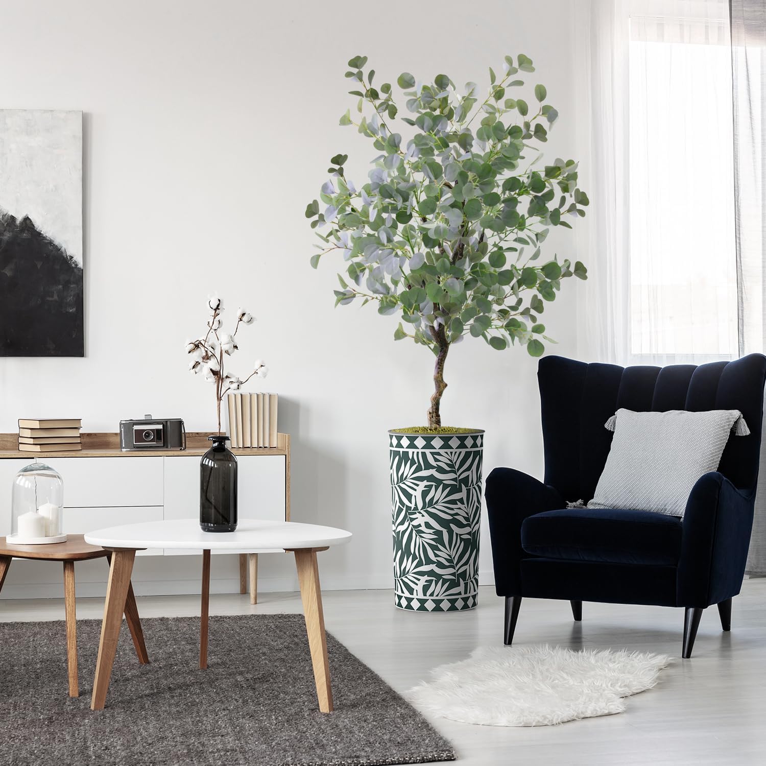Perfect for all SeasonsAt times, it can be hard to venture outside and enjoy nature. With Signwin's Eucalyptus Tree, you can create your own personal organic environment! Perfect for home and office, our artificial plants have a natural botanical allure that can alter the atmosphere of any space. Enjoy nature year-round with Signwin's Eucalyptus Tree!Easy MaintenanceReal plants can be a hassle. Constant upkeep to ensure a plant remains healthy can be a waste of energy and resources. With Signwin's Eucalyptus Tree, no watering is necessary. With stems and branches made from polyester and leaves made from silk, our Eucalyptus Tree is easy to clean! Simply wipe in soft cloth whenever necessary. Simple AssemblyOur plants come in two pieces. One piece includes the artificial plant, which is attached to the moss base. The second piece is the plastic planter. Simply insert the plant and moss base into the plastic planter for quick assemblage.Attention to DetailWe believe in crafting durable decor that stands the test of time. Our in-house design team routinely checks the details of or plants and planters to ensure perfect product quality. We strive to bring customers the most unique and durable synthetic plants. Your Eucalyptus Tree and accompanying planter will always be perfectly crafted, matching our exacting standards.