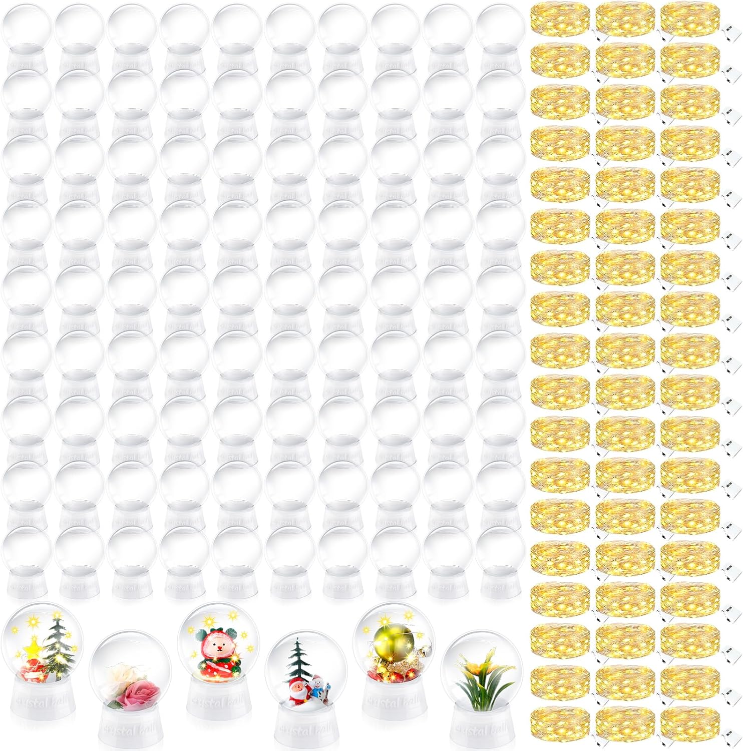 Features: Brighten up your holiday season with our snow globe for kid and LED string light set! Displaying a pure white base and clear globe, their aesthetic complements any Christmas decoration or craft setting. Our snow globes are designed to be robust, so they won't easily break or deform, ensuring many seasons of fun filled crafting. Expand your creative horizon by filling the mini snow globes with fabric, glitter, artificial snow, candy, photos or mini trees. With this DIY activity, your decoration is limited only by your imagination. Once filled, add water, close them with their lids, and surprised at the winter themed spectacle you've created. Specifications: Material: DIY snow globe: plastic LED string light: plastic, PC, copper wire Color: DIY snow globe: white, clear LED string light color: warm white Size: DIY snow globe: about 4 inches/ 10.5 cm in height, 3.35 inches/ 8.5 cm in diameter, 1.38 inches/ 3.5 cm in base height LED string light: each string has 10 lights, 19.69 inches/ 0.5 meter Package includes: 12 x DIY snow globe 12 x LED string light Notes: Manual measurement, please allow slight errors on size. The color may exist a slight difference due to different screen displays. With small objects, please keep the product away from children, lest you cause the risk of choking