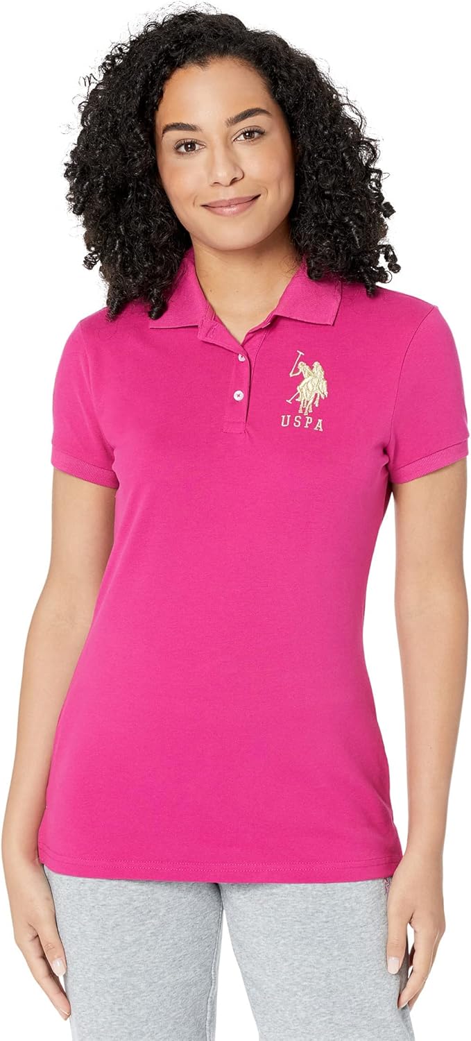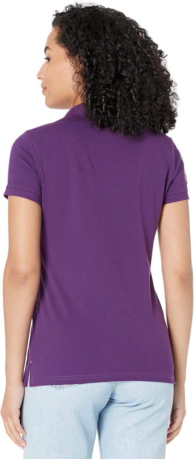 This USPA METALLIC PRINT POLO SHIRT blends classic polo style with a modern twist. It boasts a three-button front, straight hem, side vents, a prominent metallic logo on the right chest, an embroidered 'three' on the sleeve, and a metallic wordmark under the collar. Both timeless and contemporary, this shirt is elegant and exclusive. Model wears size small. Made of 95% Cotton, 5% Spandex.