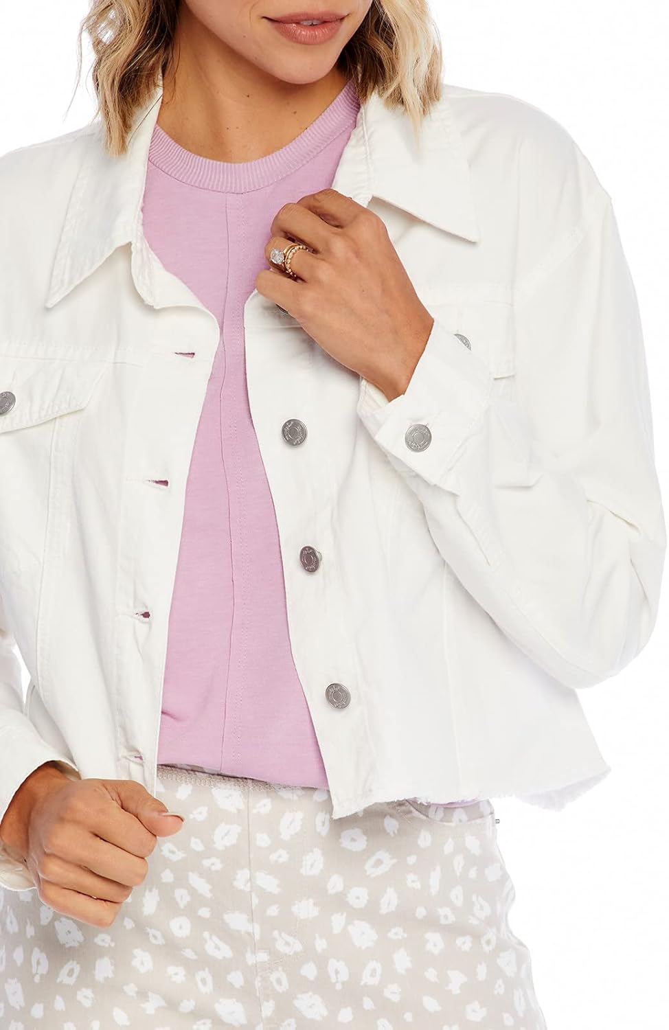 Lightweight twill jacket features slouchy relaxed fit, button front closure, chest pockets and raw edge hem. Measures approximately 19 1/2" from shoulder to hem on size small.