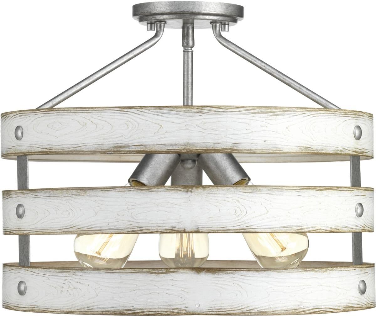 Select the perfect farmhouse home décor with the Gulliver Collection’s Three-Light Semi-Flush Convertible. Bask under the cozy country glow of the light bases grouped at the light fixture’s center ready to hold light sources. Three circular bands wrap together to create an open-design similar to rustic country baskets. The frame features a dual-toned color combination of galvanized with antique white accents. For ideal illumination, the ceiling light uses three medium base bulbs that are sold separately (75w max – LED, CFL, halogen, or incandescent). Incorporate clear light bulbs for a pinch of contemporary shine or opt for vintage bulbs to enhance the light fixture’s antique demeanor. With the ability to be fully dimmable with dimmable bulbs, the light fixture offers endless versatility when it comes to finding a place in your home décor vision. The light fixture’s organic farmhouse look is ideal for any bedroom, hallway, foyer, sitting room, kitchen, or closets in farmhouse, urban industrial, and coastal settings. It’s time to breathe new life into the mundane every day with timeless and truly transformative bathroom lighting. Make your purchase today to begin your journey to a whole new lighting experience. Progress Lighting products are designed for exceptional quality, reliability, and functionality.