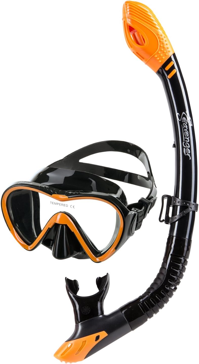Grab-And-Go PackThe Seavenger Aviator Mask And Snorkel Set features a combo pack of the essentials you need while exploring the underwater world in Hawaii, the Mediterranean, the Florida Keys and more. With a mask and snorkel that perfectly match, you get everything you need for casual offshore cruising to see the stunning oceanic floor. Crystal Clear ViewA wide single lens creates a panoramic view with no obstruction to your vision. The tempered glass construction is tough and sturdy, without adding weight or creating extra drag. The comfortable split-strap design maximizes surface area, reducing pressure created around the eyes. Plus, with easily adjustable buckles, you can get a personalized fit every single time. Easy BreathingWith dry-top technology and a float valve system, the Seavenger snorkel seals when descending under the surface of the water. This, paired with the premium one-way purge valve, creates a clear airway that's a breeze to use, even for younger snorkelers. The hypoallergenic mouthpiece, corrugated flex tube and an ergonomic shape show that the secret to success is in the little details.