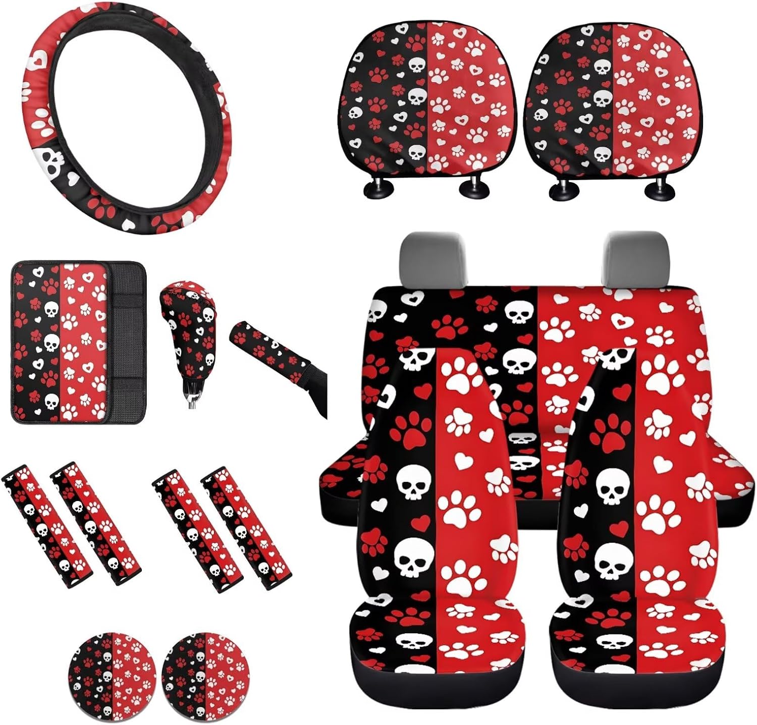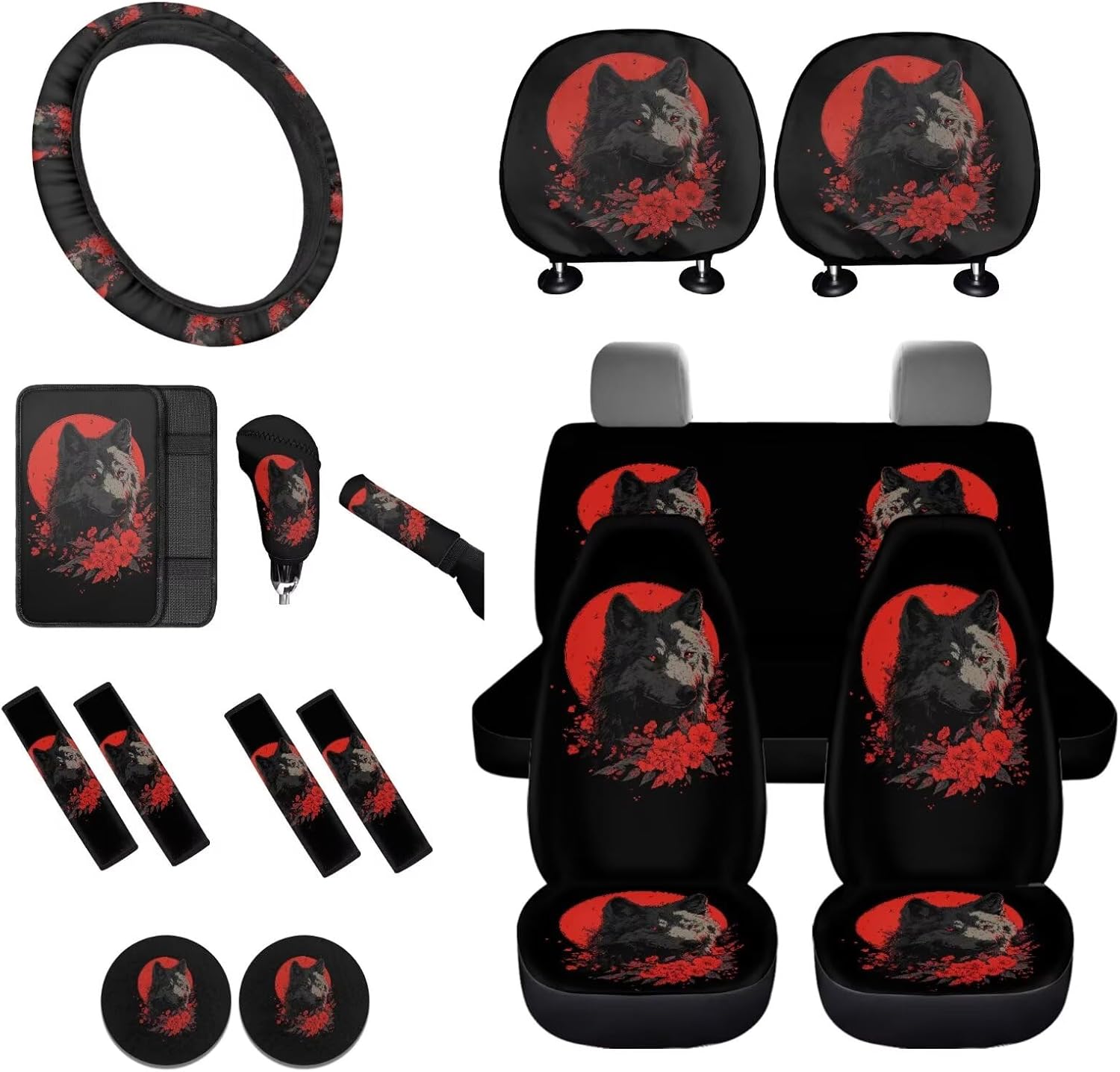 Easy to Install: These car accessories feature the personalized printing style, letting you and your guests enjoy your driving experience. Mounting this car accessories set is very easy, no complex procedures during your operation 16 Pieces in Total Package Includes: 2 front seat covers, 2 split rear seat cushions, 1 steering wheel cover, 4 seat belt covers, 1 center console armrest cover, 2 car headrests cover, 1 gear shift cover, 1 handbrake cover, and 2 car coasters Perfect Gift: We have a lot of patterns for your choice,and we provide customized services,so you can send us your favorite patterns.This multi patterned car seat cover full set will surprise your friends, mother and father. And it’s a perfect gift for Mother's Day, Father' Day, Thanksgiving Day, Halloween and Christmas Day, Independence Day, etc Tips: These car seat covers full set can be machine washed at a temperature not exceeding 45°C. Please do not soak for a long time and do not bleach. Note: Please allow for some color differences due to different lighting and measurement methods Additionally, please allow for a 1-3cm difference due to different measurement methods