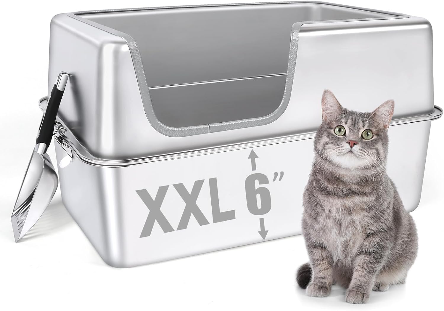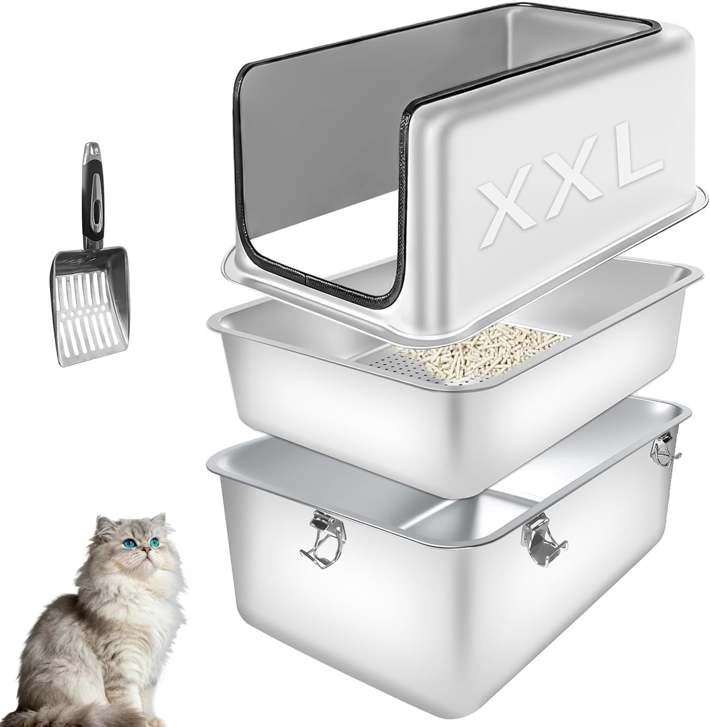 Bartuke High Sided Metal Cat Litter Box -Crafted from high-quality stainless steel, this litter box resists scratches, won’t retain odors, and cleans effortlessly. -The sealed protective edges prevent accidental injuries, while the hollow handles make moving it a breeze. -The included scoop, filter pedal and litter mat simplify daily maintenance—keeping stray litter contained and floors clean. Specification: Color: Grey Materials: Stainless Steel Dimensions: 44 x 28CM Package list: 1x cat litter box 1x litter scoop 1x filter pedal 1x litter mat 4x Non-slip feet 1x Manual