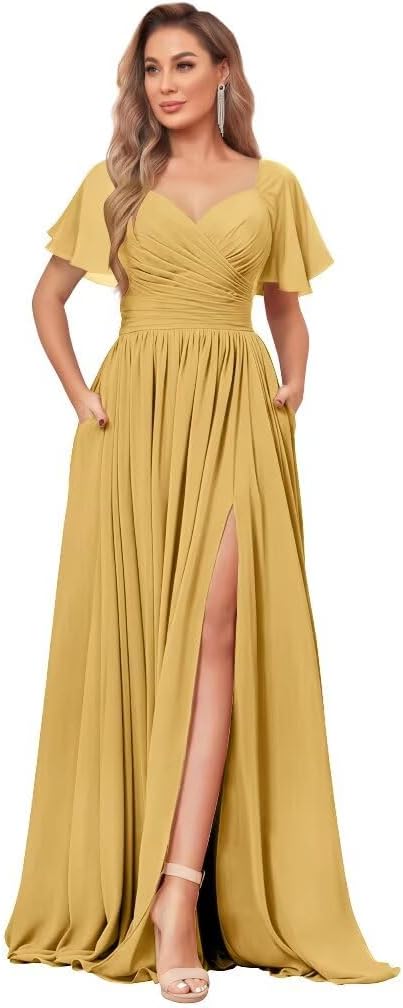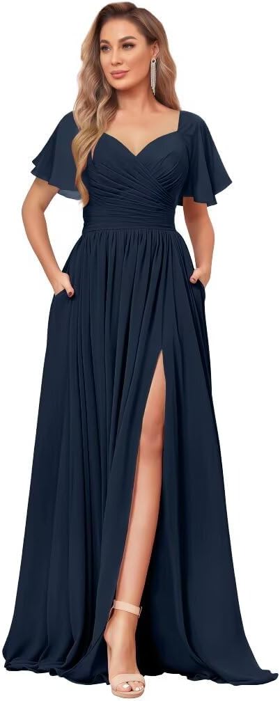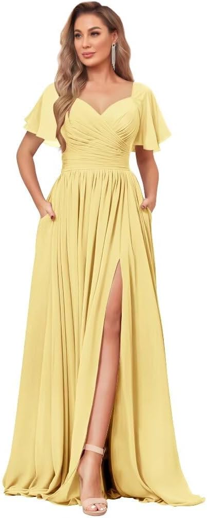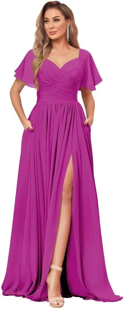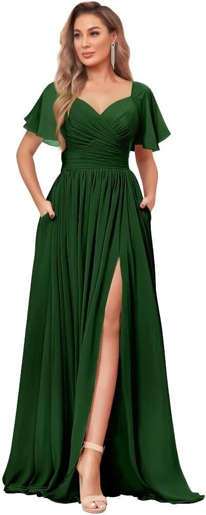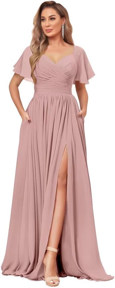 V Neck Chiffon Flutter Sleeves Formal Wedding Guest Dress with Slit Pockets