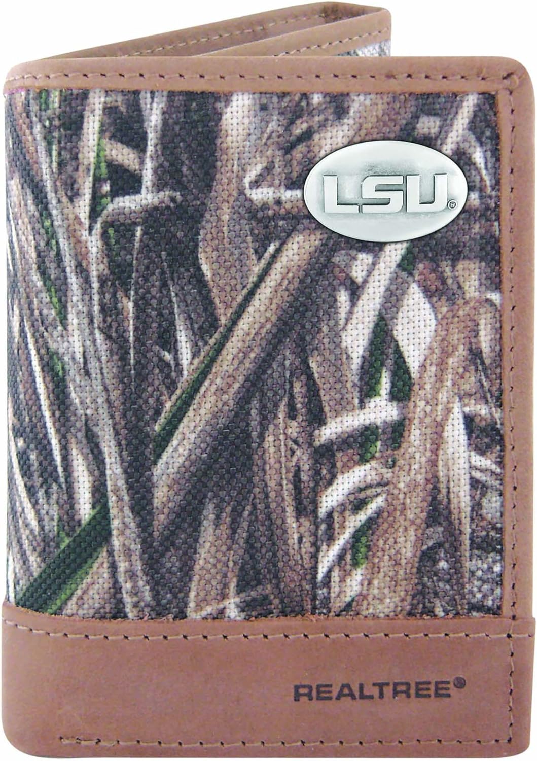 Carry your lsu Tigers school spirit and your enthusiasm for the outdoors with you at all times. This genuine Realtree camouflage pattern Trifold wallet is accented with brown genuine leather, decorated with a silver gun metal concho and features two money compartments, an ID window, six card slots, photo sleeve insert and spare key holder. Attractively boxed to make the perfect gift for the ultimate Tigers fan.