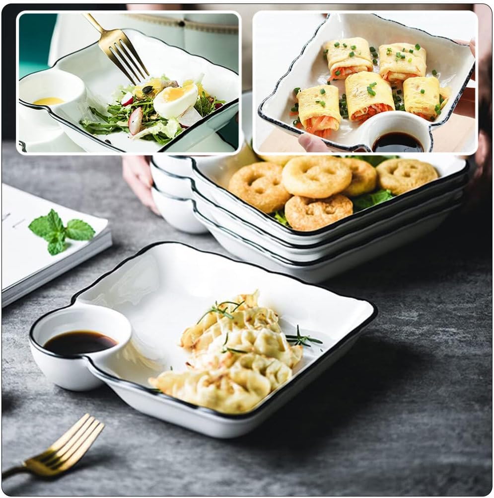 Features:🍟【Ceramic Dumpling Plate】Ceramic Japanese sushi plates are meticulously crafted by hand using high-grade ceramics. These plates can be used safely in the oven, microwave, refrigerator, and dishwasher, freeing up your time and allowing you to enjoy your food with ease.🍟【Thoughtful Design】Our porcelain square serving plates feature an attached saucer dish, eliminating the need for additional containers when pouring various sauces. Furthermore, the stackable design improve efficient use of storage space.🍟【No-Spilling Design】These plastic snack plates with sauce plates have slightly raised edges, forming a proper space for food, for holding or juicy food, no need to worry the spilled food will stain your counter.🍟【Easy to Clean and Store】This ceramic tray is dishwasher safe, provide you the maximum versatility and convenience. When not in use, they can be stacked well together without taking up too much cabinet space.🍟【Versatile Snack Serving Dishes】Our ceramic appetizer trays are ideal for kitchens, barbecues, birthday parties and more. Also, it is for serving a variety of food such as sushi, chip, snacks, desserts, fruits, appetizers and other other pastries.Specifications:- Color: Assorted Color.- Material: Ceramic.- Size: 18.50X17.30X3.80cm/7.27X6.80X1.49in.Package Including:2 x Dumpling Plates